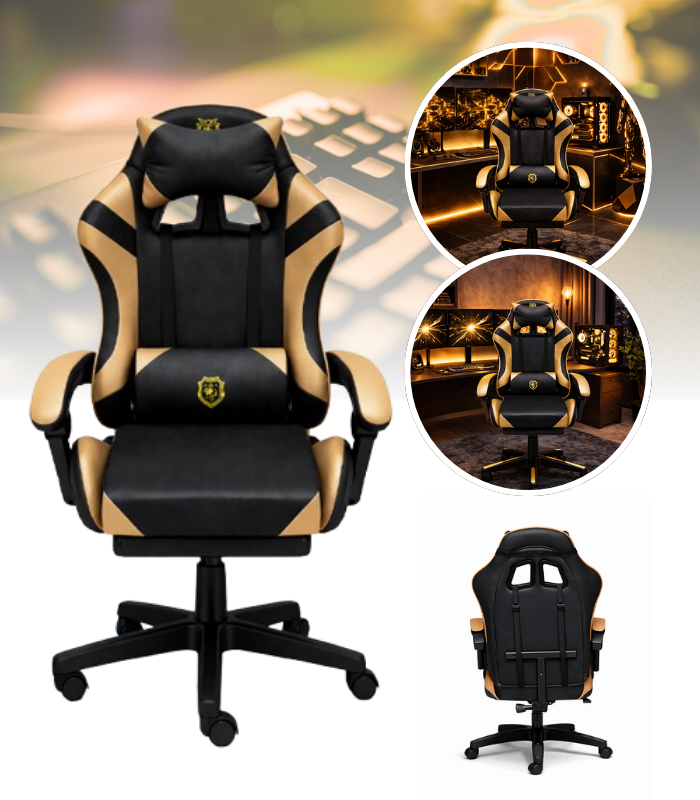 FOTEL GAMINGOWY CZARNO - ZŁOTY DLA GRACZA REGULOWANA WYSOKOŚĆ MEBLE GAMINGOWE FOTEL Z PODNÓŻKIEM ERGONOMICZNY MEBLE DO BIURA, POKOJU DZIECIĘCEGO PREZENT DLA GRACZA