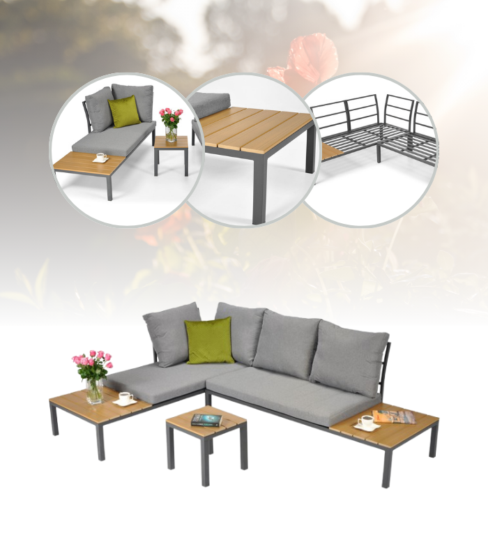 ZESTAW MEBLI OGRODOWYCH KAMELEON NAROŻNIK OGRODOWY ALUMINIOWY SZARY ZESTAW MODUŁOWY 2 SOFY + STOLIK FUNKCJA ŁÓŻKA POLYWOOD NOWOCZESNY TARAS BALKON OGRÓD