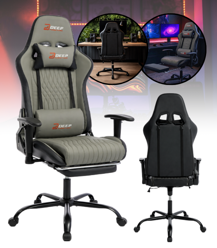 FOTEL GAMINGOWY SZARY DLA GRACZA REGULOWANA WYSOKOŚĆ MEBLE GAMINGOWE Z WYSUWANYM PODNÓŻKIEM WYGODNY ERGONOMICZNY MEBLE DO BIURA POKOJU DZIECIĘCEGO