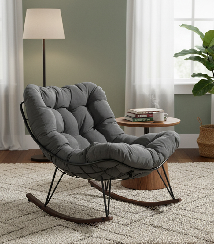 Stylowy i niezwykle wygodny fotel bujany to idealne miejsce na odpoczynek po długim dniu. Posiada szerokie, 80-centymetrowe siedzisko oraz miękką poduszkę, które gwarantują pełen komfort i relaks. Delikatnie zaokrąglony kształt dopasowuje się do sylwetki, wspierając kręgosłup i przynosząc ulgę zmęczonym mięśniom. To doskonały sposób, by po pracy zanurzyć się w spokoju i odprężeniu.