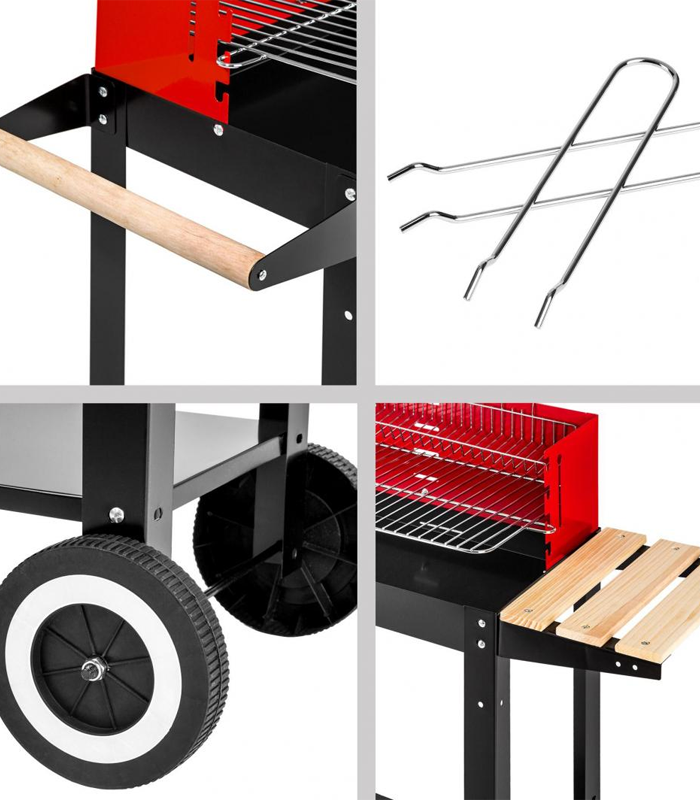 Grill wykonany został z metalu malowanego proszkowo, co zapewnia odporność na wysoką temperaturę oraz trwałość użytkowania. Stabilne nogi i przemyślana konstrukcja gwarantują bezpieczeństwo podczas grillowania. Składane elementy ułatwiają transport i przechowywanie grilla poza sezonem.