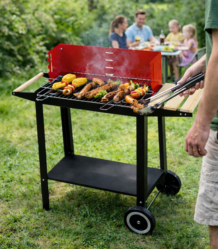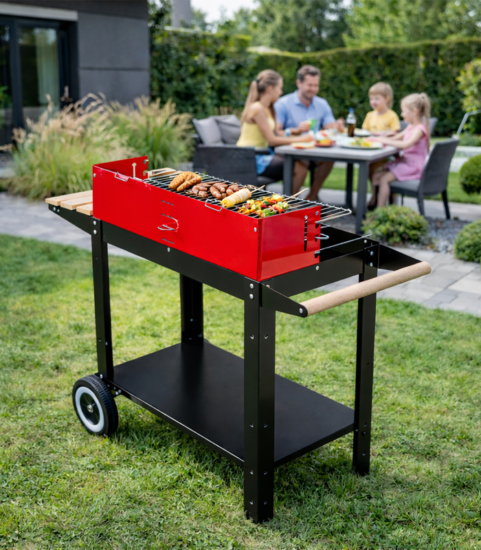 Dzięki kółkom transportowym grill można łatwo przestawić w dowolne miejsce, a dolna półka zwiększa funkcjonalność, oferując przestrzeń na węgiel lub inne niezbędne akcesoria.