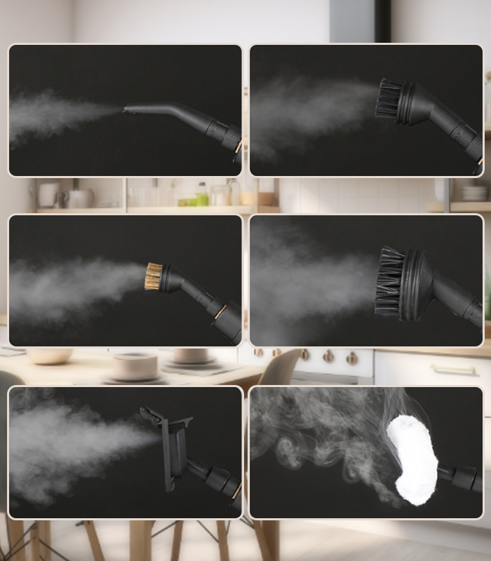 Dzięki bogatemu zestawowi wymiennych końcówek, nasza myjka parowa oferuje nieskończone możliwości zastosowania. To jedno urządzenie do czyszczenia całego domu, samochodu i trudno dostępnych miejsc!