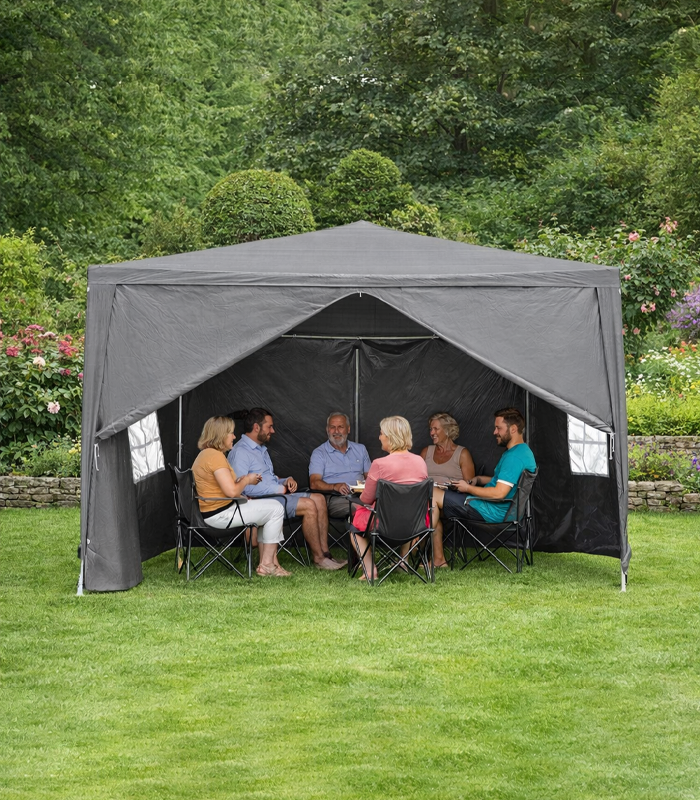 Praktyczny i solidny pawilon ogrodowy w kolorze szarym, idealny do ogrodu, na taras, działkę oraz imprezy plenerowe. Zapewnia skuteczną ochronę przed słońcem i lekkim deszczem, tworząc komfortową przestrzeń do wypoczynku i spotkań na świeżym powietrzu.